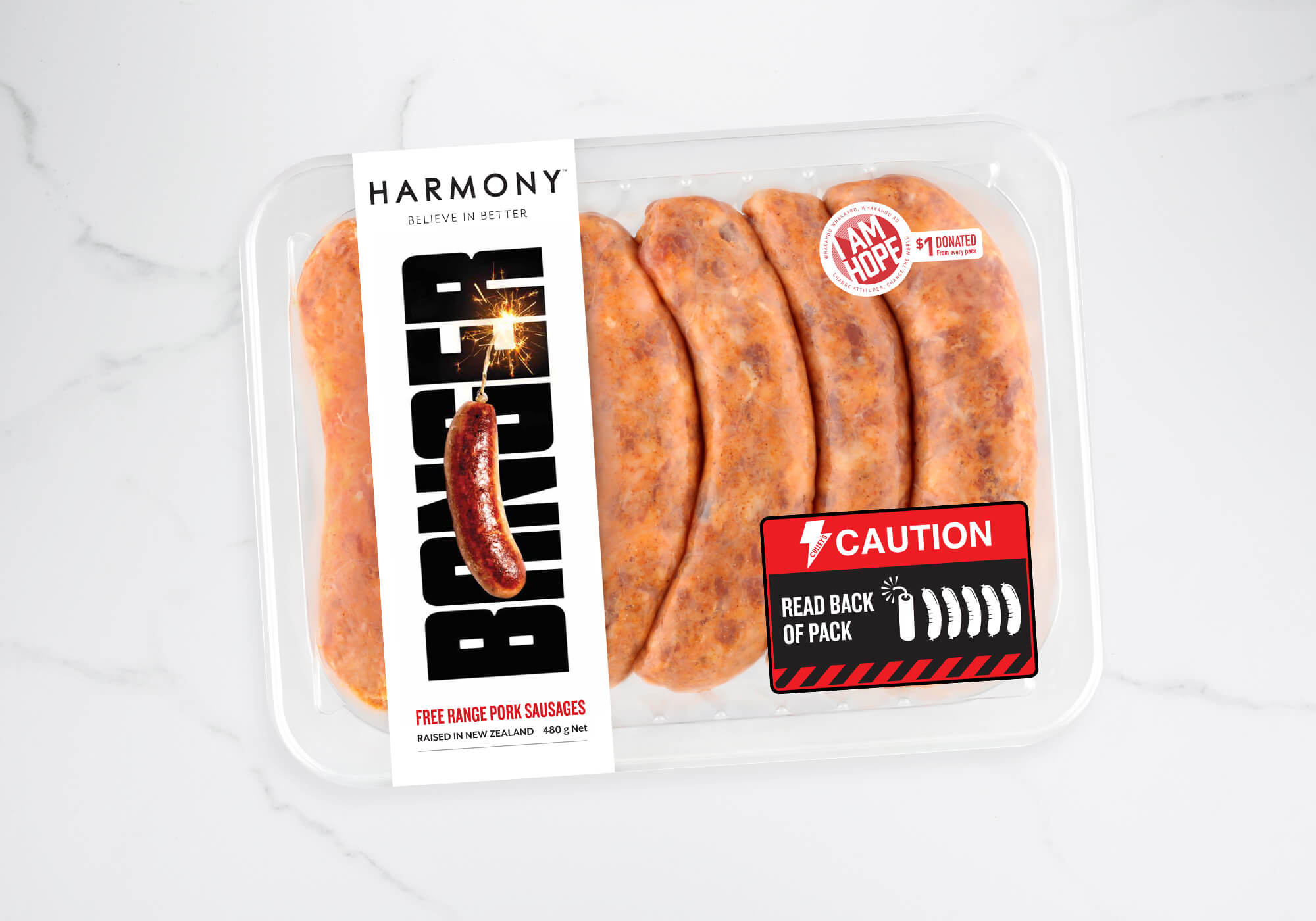 In 2023, we created a campaign with Neat Meat for their sub-brand, Harmony. Focusing on the idea that not all sausages in New Zealand are made from NZ meat and that you don’t really know what it is in your sausage. So we created the Banger Sausage, a sausage within a pack that measured 1 million on the Scoville scale.